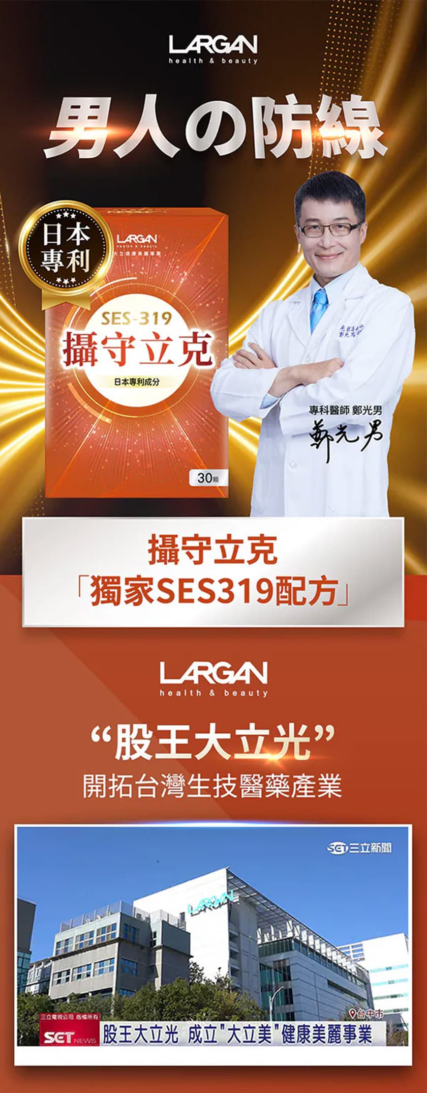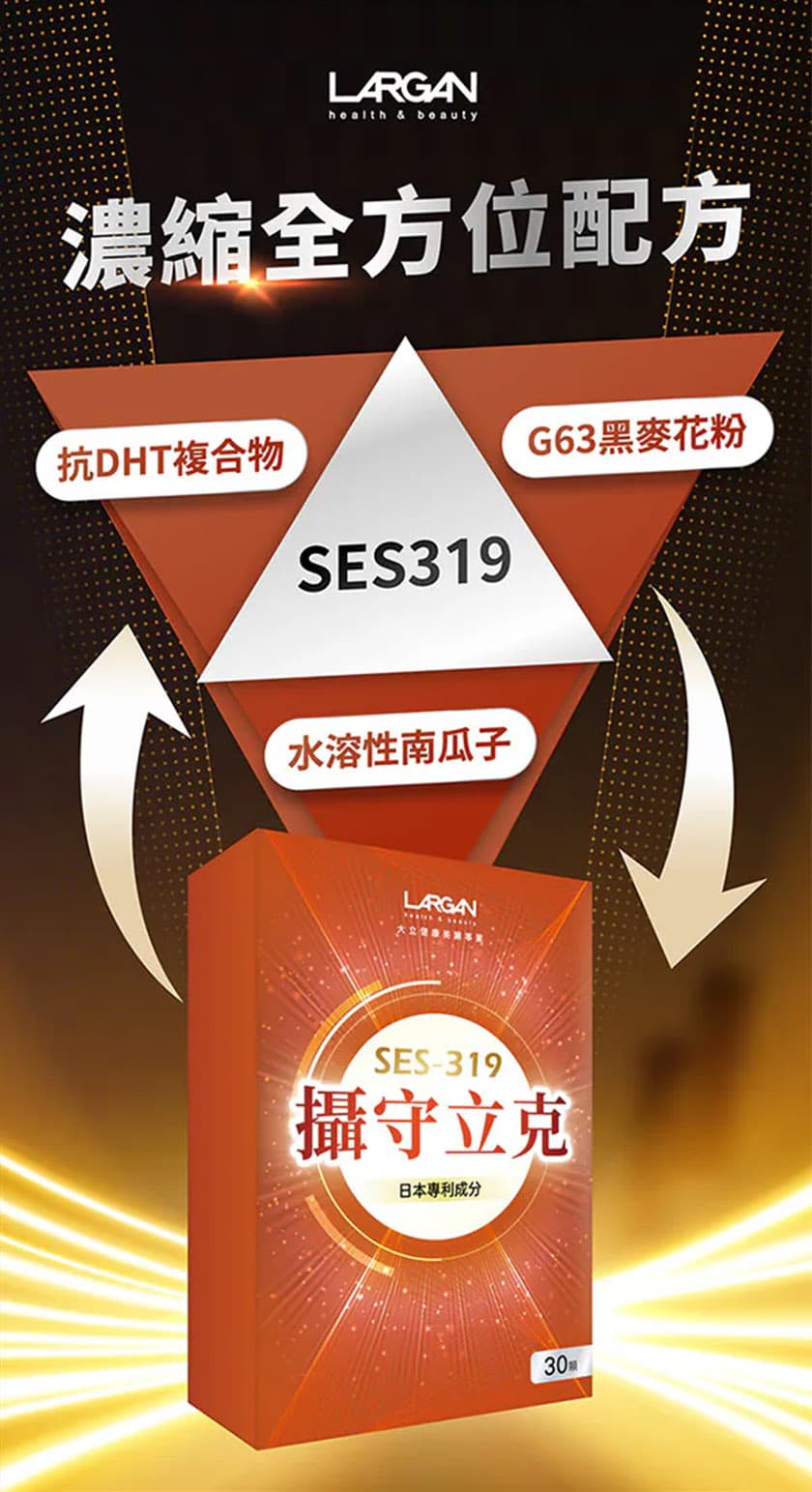 Largan Exosome Urinary Incontinence is a daily health supplement specially formulated for mature men. It features the proprietary SES-319 Repair Factor, combined with a Japanese patented anti-DHT complex, along with rye pollen and water-soluble pumpkin seed extract. This formula is designed to support male urinary tract and prostate health at the root level. It is recommended to take before breakfast with warm water.