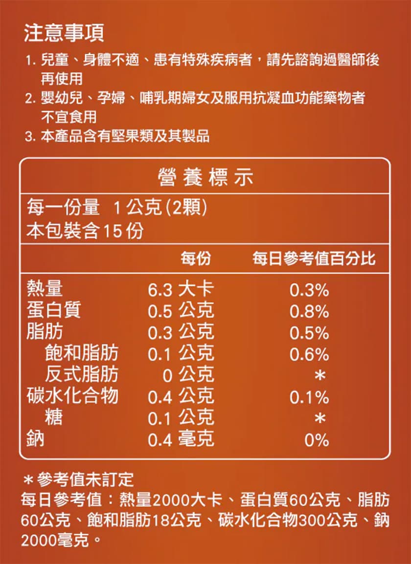 – Contains nut-derived ingredients (such as pumpkin seed); individuals with nut allergies should avoid consumption.